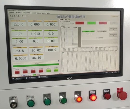 准备工作做好之后就可以对油泵进行测试了,按下遥控上的自动启动,它就按软件上的设定点来测试,最终测试界面将会对测试数据进行显示,测试参数包括电压、电流、功率、进口压、出口压、流量,电源频率,阀门开度、噪声。