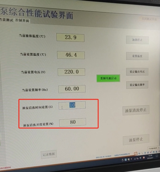 当我们按气动密封和出口密封的按钮,油泵就会自动锁紧,避免上手操作沾上油污。拧紧之后开启排气功能,把里面的空气排出来。然后点击清洗按钮就可以对油泵进行自清洗,把里面的渣渣清洗掉,清洗时间和清洗开度可以在软件测试界面设置。