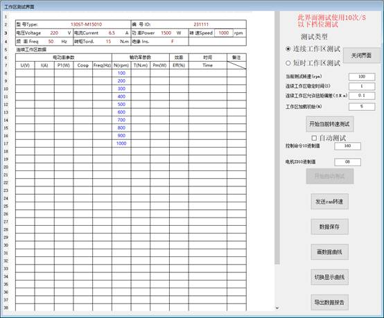 电机综合检测设备短时工作区:测试电机在当前转速下所能输出的最大扭矩,测试需要注意电机会大量发热,需要驱动器有扭矩限制保护功能。